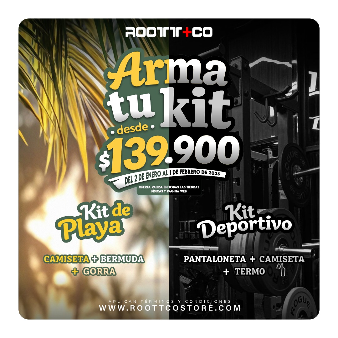 🔥 ¡INICIA EL AÑO ARMANDO TU KIT A TU ESTILO! 🔥 . En ROOTT+CO tú eliges 💪🌴 👕 Kit de Playa: camiseta + bermuda + Gorra por $139.900 🏋️‍♂️ Kit Deportivo: camiseta deportiva + pantaloneta + termo por $149.900 . 📍 Visítanos en nuestras tiendas físicas a nivel nacional 🗓️ Válido hasta el 1 de febrero de 2026 . ✨